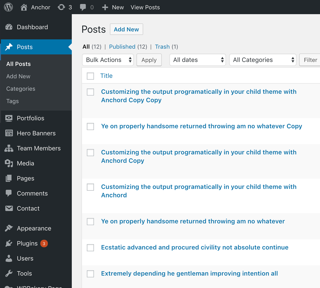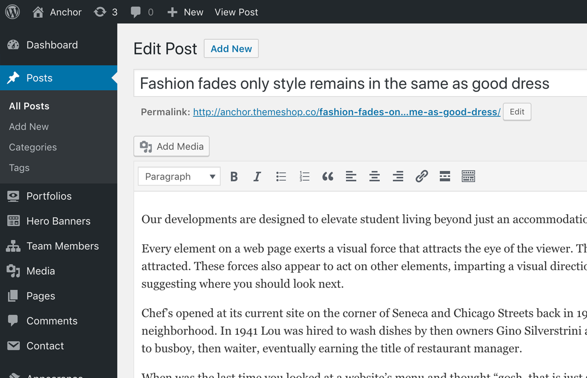 Step 2 – Click on Add New to make a new post. Create a title and insert your post content in the editing field. You can use any of our short code Agensy elements inside the post.